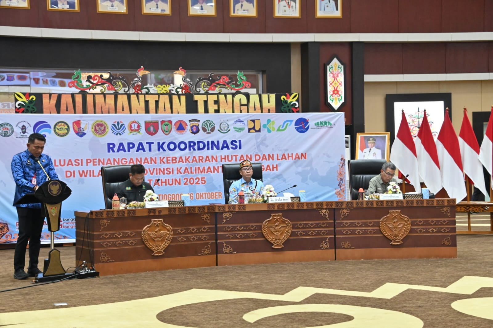 Plt. Sekda Leonard S. Ampung, mewakili Gubernur, membuka Rakor Evaluasi Penanganan Karhutla di Wilayah Provinsi Kalteng, bertempat di Aula Jayang Tingang, Lantai II Kantor Gubernur, Kamis (16/10/2025).