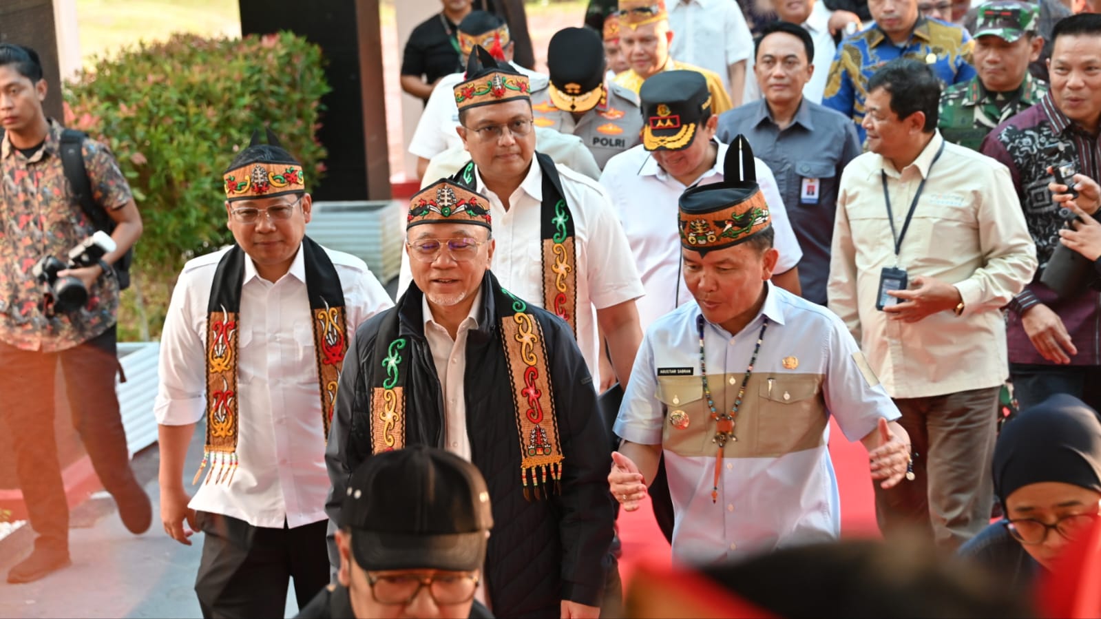 Menko Zulkifli Hasan dan rombongan tiba di Palangka Raya dengan Pesawat Batik Air ID-6200. Setibanya di Bandara Tjilik Riwut, Menko disambut dengan prosesi adat Dayak Pemasangan Lawung dan Pengalungan Selendang Upak Nyamu.