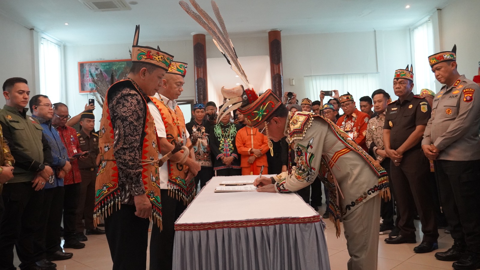 Penyambutan kedatangan Menkop RI dan Jamintel Kejagung RI diawali dengan prosesi penetapan Warga Kehormatan Adat Dayak, pemasangan kelengkapan Adat Dayak, serta pengucapan janji Adat sebagai Warga Kehormatan Masyarakat Dayak oleh Menkop RI dan Jamintel Kejagung RI yang dilanjutkan dengan penandatangan Janji Adat.