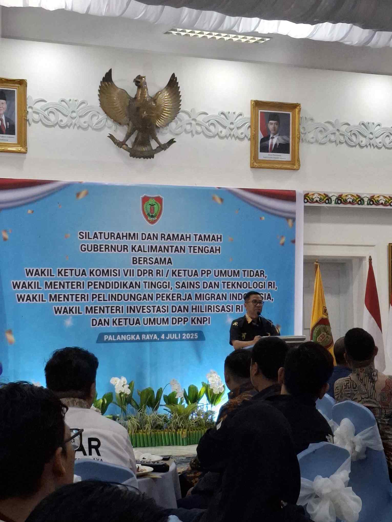 Gubernur menyambut dan menjamu Wakil Ketua Komisi VII yang juga Ketua Umum Pengurus Pusat (PP) Tunas Indonesia Raya (Tidar) Rahayu Saraswati Dhirakaya Joyohadikusumo, Wakil Menteri (Wamen) Pendidikan Tinggi, Sains, dan Teknologi (Diktisaintek) Prof. Fauzan, Wamen Investasi dan Hilirisasi Todotua Pasaribu, Wamen Perlindungan Pekerja Migran Indonesia (P2MI) sekaligus Ketua Panitia Pelaksana Rapat Pimpinan Paripurna Nasional (Rapimpurnas) Komite Nasional Pemuda Indonesia (KNPI) Tahun 2025 Dzulfikar Ahmad Tawalla, serta Ketua Umum DPP KNPI Muhammad Ryano Panjaitan di Istana Isen Mulang Palangka Raya pada Jumat (4/7/2025) malam.