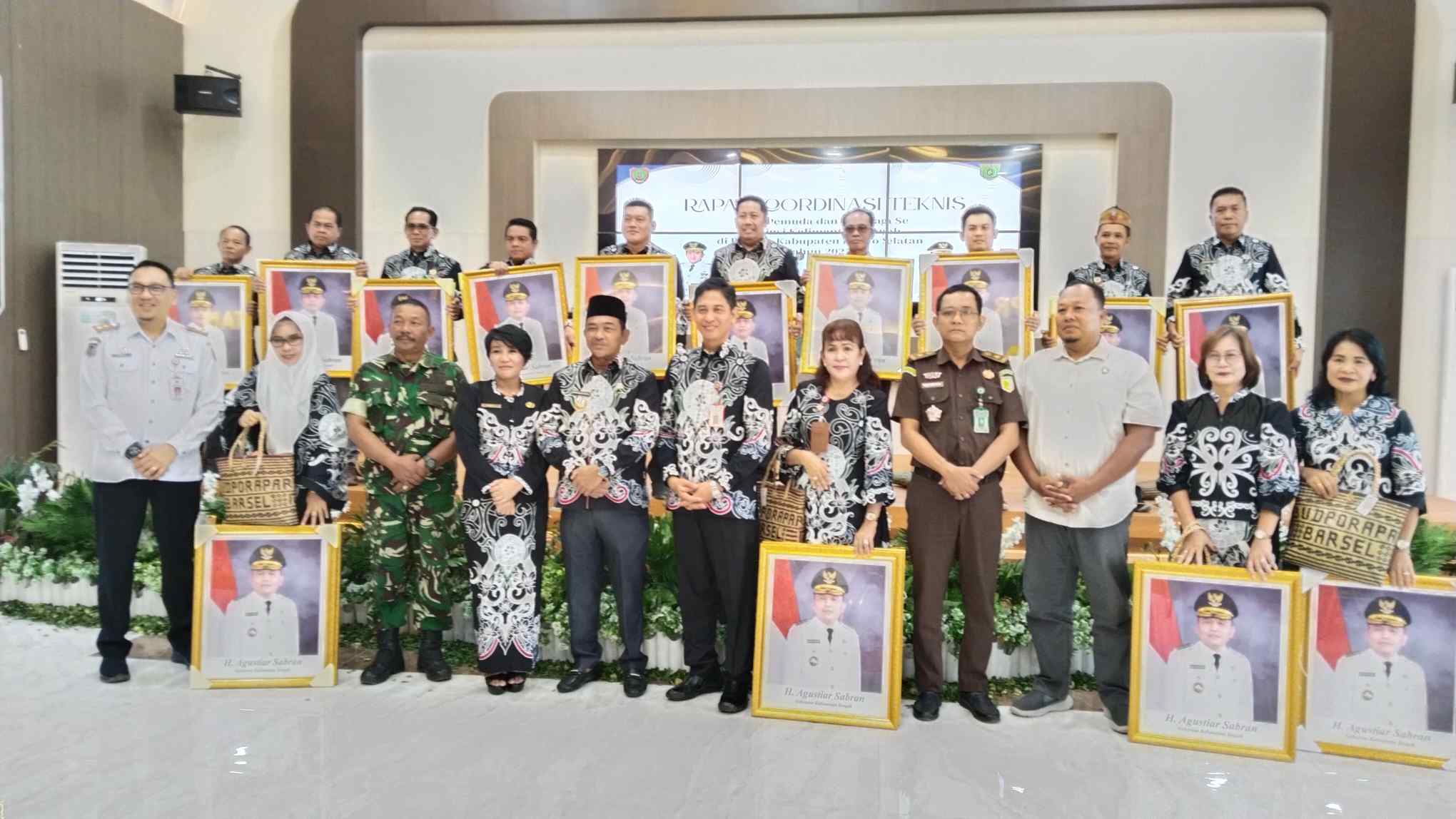 Karo Adpim Johni Sonder menyerahkan foto resmi Gubernur dan Wagub kepada Dispora se-Kalteng yang menggelar Rakornis di Buntok, Barsel, Rabu (16/4/2025).