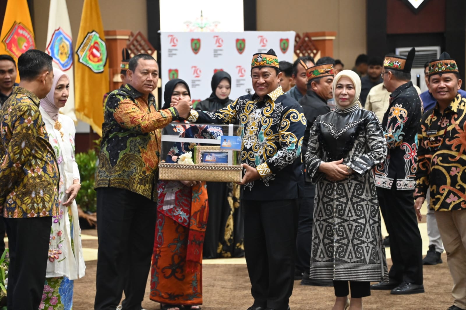 Gubernur Agustiar Sabran beserta Ketua TP PKK Kalteng Aisyah Thisia Agustiar Sabran menyerahkan cinderamata dalam acara Kenal Pamit Kajati Kalteng di Aula Jayang Tingang, Lantai II Kantor Gubernur, Jumat (18/7/2025) malam.