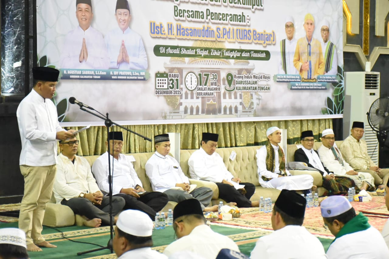 PALANGKA RAYA – BIRO ADPIM. Gubernur Kalimantan Tengah (Kalteng) H. Agustiar Sabran bersama Wakil Gubernur (Wagub) H. Edy Pratowo menghadiri Peringatan Isra’ Mi’raj Nabi Muhammad SAW yang dirangkaikan dengan Muhasabah Menyambut Tahun Baru 2026 serta Haul Guru Sekumpul, bertempat di Masjid Raya Darussalam Palangka Raya, Rabu (31/12/2025).