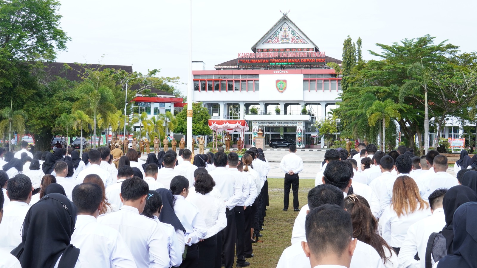 Plt. Sekda Leonard S. Ampung memimpin apel pagi perdana gabungan CPNS dan PPPK Tahap I Pemprov Kalteng di Halaman Kantor Gubernur, Senin (26/5/2025) pagi.