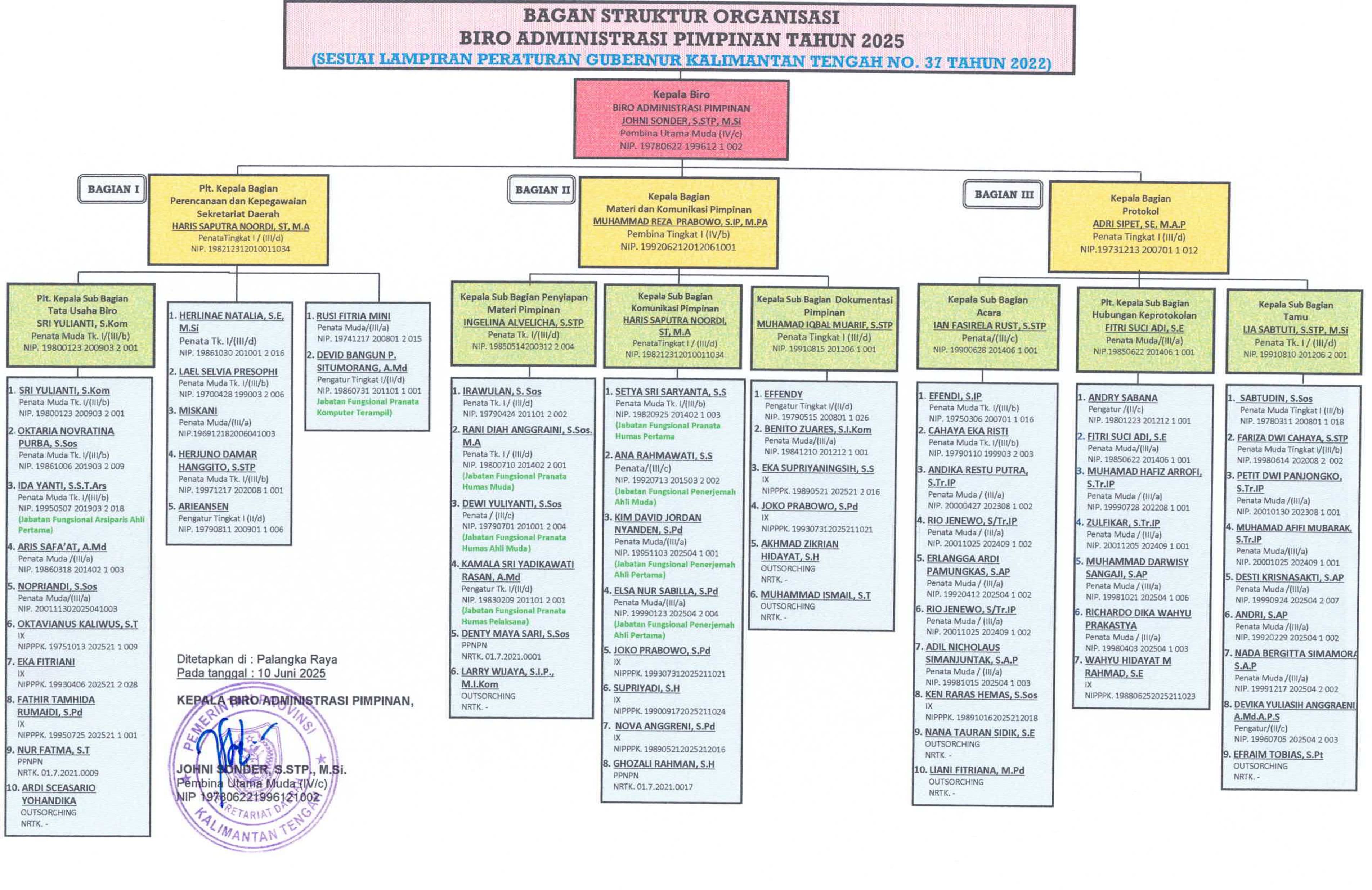 Berdasarkan Peraturan Gubernur Kalimantan Tengah Nomor 1 Tahun 2020 tentang Kedudukan, Susunan Organisasi, Tugas, Fungsi, dan Tata Kerja Sekretariat Daerah Provinsi Kalimantan Tengah bahwa struktur organisasi dan tata kerja Biro Administrasi Pimpinan adalah sebagai berikut :
