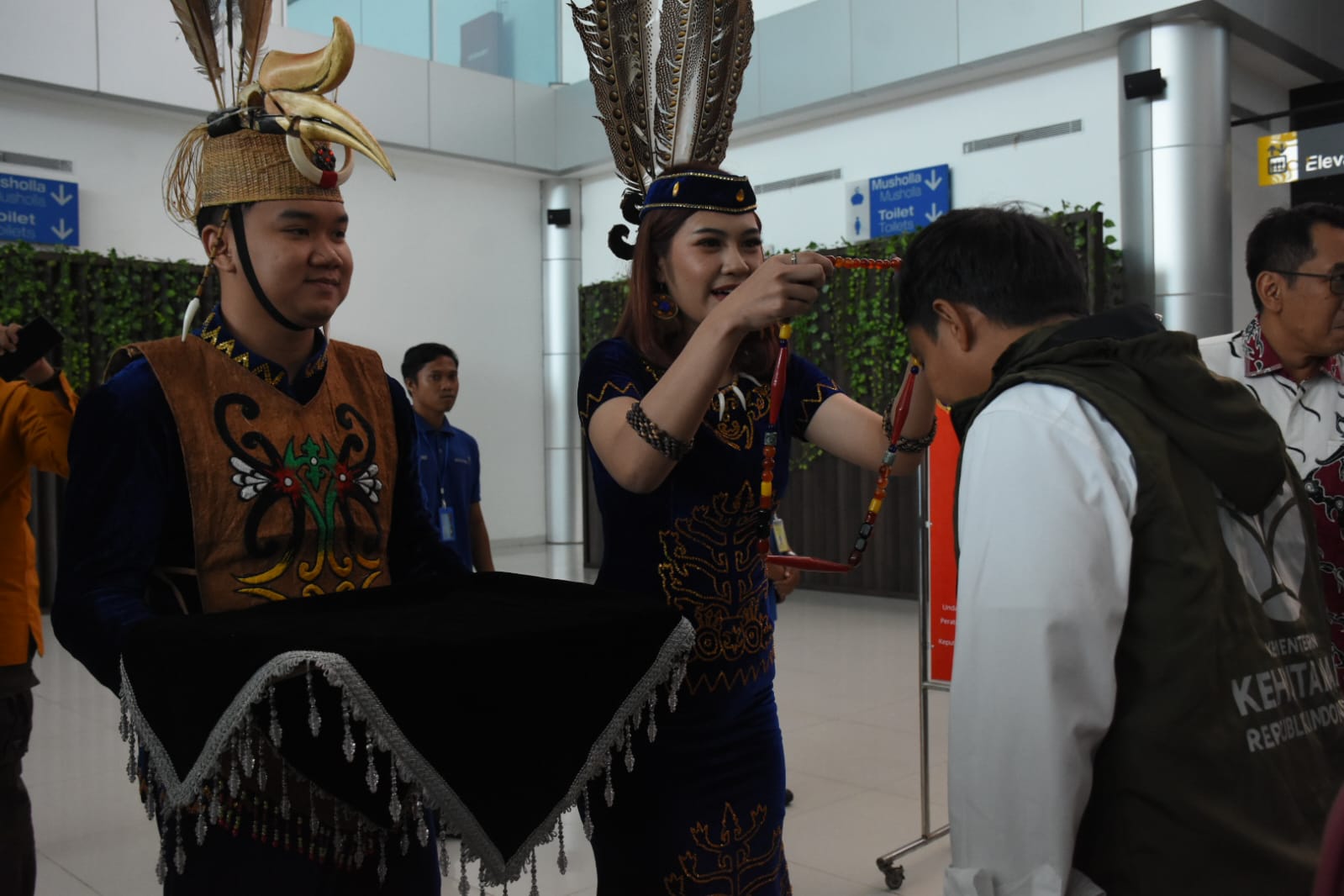 Kedatangan Menhut disambut dengan prosesi adat Dayak Pengalungan Lilis Lamiang.